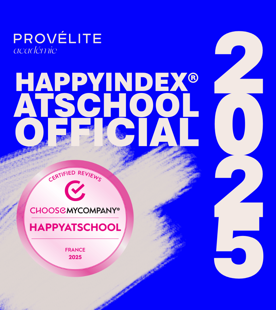 Provélite Académie a reçu l’accréditation HappyIndex®AtSchool Official 2025 par ChooseMyCompany, une reconnaissance prestigieuse qui témoigne de notre engagement envers le bien-être et la satisfaction de nos étudiants.